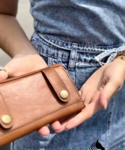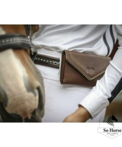 Pochette pour téléphone en cuir à accrocher sur la ceinture. Avec logo sur rabat, se ferme grâce à un bouton pression. Passepoil pailleté, doré pour les coloris havanes et cognac, et gris pour le coloris noir.