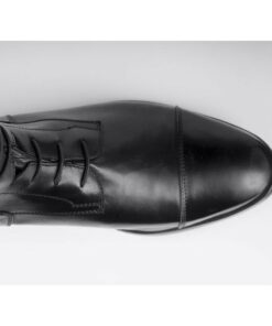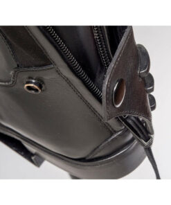 La semelle décrit un mouvement de vague pour faciliter le mouvement de la cheville et améliorer la descente des talons. La fermeture éclair sur l’arrière est très résistante et renforcée par 2 boutons à pressions en laiton et haut et en bas de la jambe. Le rabat en cuir en haut est doublé d’une couche disposant d’une encoche destinée à accueillir la tête de la fermeture éclair pour rendre impossible l’ouverture de la botte pendant l’effort.