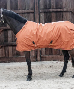 La couverture est de forme anatomique et ne comporte aucune couture sur le dos pour éviter les fuites. Grâce à la peau de lapin artificielle, la couverture se remet toujours à la bonne place après que le cheval se soit roulé. La couverture est équipée d’une fermeture autoaggripante avec 2 fermetures frontales, 2 sursangles croisées en tissu de ceinture de sécurité et une courroie de queue recouverte de plastique (pour un nettoyage facile). Pour plus de protection, il est possible d’acheter un couvre-cou séparé.