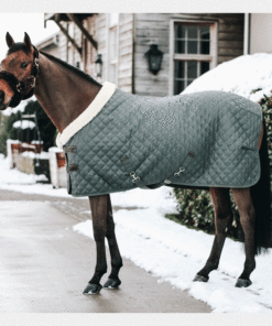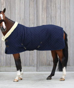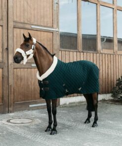 La couverture de présentation est fabriquée en polyester haute ténacité 600D avec un surpiquage en diamant à la fois élégant et intemporel. Cela rend la couverture incroyablement difficile à déchirer et évite que les copeaux ne collent à la couverture. Pour éviter toute pression sur l’épaule et le garrot, le col de la couverture Show Rug est fabriqué à partir de notre populaire peau de mouton artificielle. Outre son aspect élégant, la peau de mouton artificielle est également beaucoup plus confortable. Par exemple, lorsque le cheval mange, la couverture n’appuiera pas sur la poitrine. La couverture est remplie de 160 g de fibres de rembourrage, qui ont les mêmes performances que le duvet mais n’absorbent pas les odeurs. Pour éviter les marques de frottement, la couverture est doublée de notre peau de lapin artificielle. Ce tissu est extrêmement doux et crée un effet brillant sur le pelage du cheval. En plus de cela, la peau de lapin artificielle crée de minuscules poches d’air. Ces poches emprisonnent et retiennent la chaleur corporelle du cheval, créant ainsi une couche isolante supplémentaire. La combinaison de ces matériaux crée une couverture très respirante avec un rapport chaleur/poids élevé.