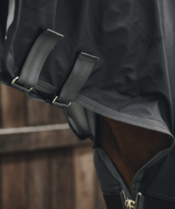 La Rain Coat est un must-have pour tous les cavaliers sortant en compétition, protégeant tout autant le cheval que l’équipement contre les fortes pluies. La couverture est compacte, très légère et 100% imperméable. Facile à mettre au-dessus d’une autre couverture, ou sur un cheval déjà sellé. Le matériau est composé à 100% de polyester, avec un revêtement en PU à l’extérieur qui garantira 100% d’étanchéité. Un petit velcro au niveau de la nuque permettra d’attacher la couverture au licol ou à la bride. Les sangles velcro au cou, une fermeture simple à l’avant et au niveau de la sangle ainsi qu’une courroie de queue permettront à la couverture de tenir en place. Elle est lavable en machine à 30 °, pas de sèche-linge.