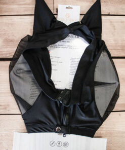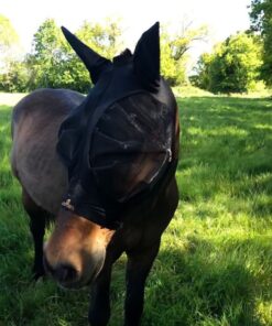 La maille au niveau des yeux est robuste et évite toute irritation car elle n’est pas en contact avec la tête du cheval. Lorsqu’elle s’écrase par une action du cheval, elle retourne à sa forme initiale toute seule. Le masque comporte une fermeture à éclair et un bouton pression ainsi qu’une ouverture au niveau du toupet et est spécialement conçu pour être lavé à la machine à 30° (pas de sèche-linge).